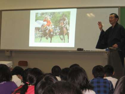 能楽師であり,紫明校の学校運営協議会の理事長も務めてくださっている河村 晴久さんに講師として来ていただき,「葵祭」についてのお話を聞かせていただきました。
