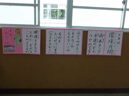 6月10日の朝会では「環境月間」について話をしました。環境を守っていくための身近な取り組みについて考えました。アサガオやミニトマトやオクラなどの水やりは、丸い大きな「雨水タンク」の水を利用していること。水道の栓をしっかりと締めること。使っていない部屋の電気を消すこと。持ち物には名前を書いて、最後まで大切に使うこと。牛乳パックのリサイクル。緑のカーテンの取り組み。ごみゼロ運動のこと。そして、学校では、毎日出るごみを「燃えるごみ」と「燃えないゴミ」に分けていること。一人ひとりが環境について考えてみるようにと話しました。6月は環境月間です。ご家庭でも子どもたちと一緒に話題にしていただけると嬉しいです。