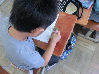 教室に戻ってからは虫眼鏡を使って生き物を観察しました。