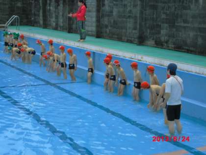 担任から,プールに入るための合図を一つ一つ教えてもらい,大きなプールの中へ。少し冷たかった水に大歓声が上がっていました。