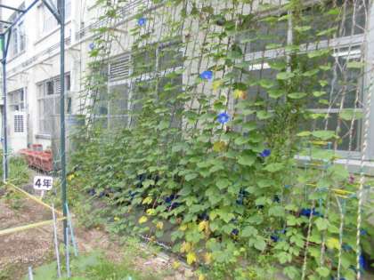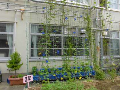 緑のカーテン(琉球朝顔)が順調に育っています。今年は、例年になく立派な緑のカーテンになりそうです。