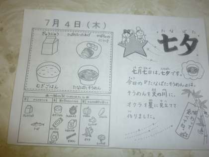 今日の給食は、行事献立「七夕」です。たなばたそうめんは、そうめんを天の川に、オクラを星に見立てています。外は強い雨が降っていますが、きっと子どもたちは七夕のことを思い浮かべながらいただくことと思います。かぼちゃの煮つけやサバの竜田揚げもおいしそうです。「いただきます。」