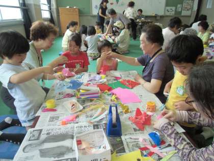 ひまわり学級と1年1組の子どもたちが,「七夕の集い」にお招きいただきました。はじめは地域の方々と一緒に,笹に飾る素敵な飾りを作りました。折り紙の折り方や切り方を,お年寄りの方々がていねいに子どもたちに教えて下さいました。出来上がった飾りを,子どもたちは楽しそうに笹に飾っていました。
