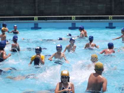 今日は朝から気温が高く,教室に入ると「あついよ〜。」の声。3,4年生は3・4時間目に水泳学習をしました。「こんな暑い日に入れるなんてラッキー★」という言葉通り,とても気持ちのいい水泳日和でした。水泳3回目ということもあり,だいぶ水に慣れてきたように思います。自分のめあてにそって,一生懸命練習しています。