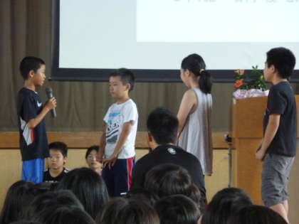 今年度初めての紫明タイムがありました。本校の目指す子ども像「考えよう 自分で」「伝えよう 言葉で」「受け止めよう 相手を」を知らせ、紫明タイムのねらいやどんなことに頑張ってほしいのかという話がありました。今年から、全校で今月の詩を「紫明タイムの詩」として決め、朝の会などで練習してみんなで声を合わせようと取り組んできました。今回は「ありがとう」でした。もうしっかりと暗記しているようでした。みんなで心をこめて声に出すことはとっても気持のいいものですね。そして5年生の発表でした。テーマは運動会でした。司会者も5年生が担当し、自分の今日のめあてを言いました。聞いている子どもたちからも、たくさん感想や意見が出てきて、発表者とのやり取りができました。保護者の方々も見に来ていただきました。ありがとうございました。みんなが一つになれた時間でした。次の紫明タイムは、9月30日 3年生です。お楽しみに!