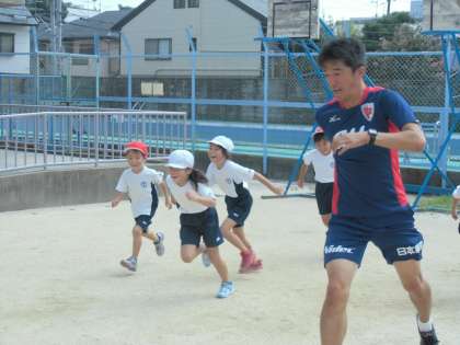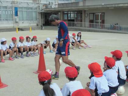 コーチのお話に,子どもたちは興味津々の様子でした。かっこいいサッカーボールに,1年生はわくわくしていました!