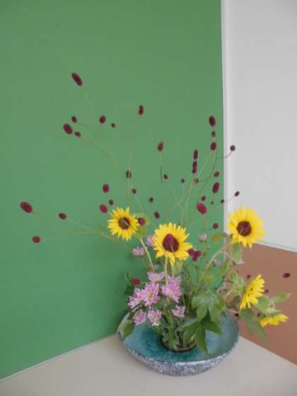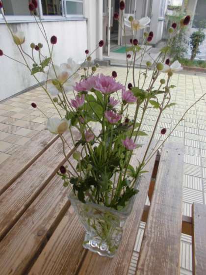10月を迎えて、教育ボランティア(華道)の方が花を生けて下さいました。紫の丸い花はワレモコウです。いつもありがとうございます。