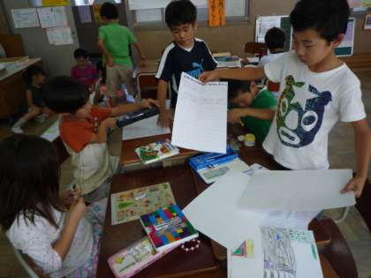 長ーい絵まきもの,写真ではなく,自分たちで書いた絵をつかった紙しばいやポスター・・・絵も文もていねいで,「調べたことをしっかりまとめるんだ!」という気合が見られます。