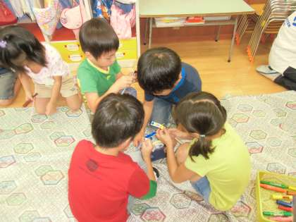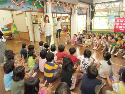 紫明小学校の1年生が,紫明幼稚園へ行ってきました。1年生と幼稚園の子どもたちが一緒に,「握手あそび」をしたり,「紙コプター」を作って飛ばし合ったり・・・。会場に,子どもたちの歓声が響いていました。