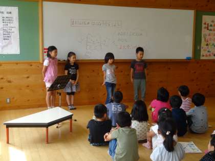 今日は,上総幼児園のお友達をお迎えして町探検についての発表会を開きました。子どもたちは,緊張している様子でしたが自分たちが頑張って作製した絵巻物や紙芝居を持って生活科室にむかいました。「大きな声を出して伝える」「動きを入れて分かりやすく話せるように頑張る」と自分なりのめあても考えていました。今回は,司会・はじめ,おわりの言葉など子どもたちが進めていきました。背筋をピンとのばしてどうどうと話をする姿がとても輝いて見えました。