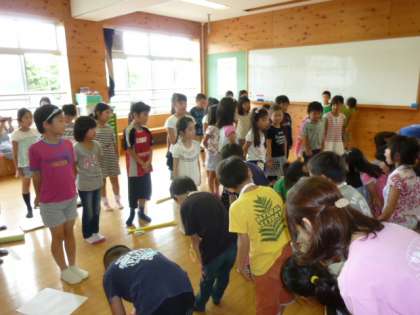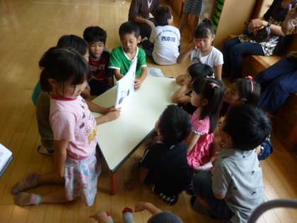 2年生では、生活科の学習で紫明の町探検をしてきました。自分達でまとめたい方法を考えました。そして、町のすてきを幼児園の年長さんに伝えようということになりました。自分達が分かったことや伝えたいことを年長組さんにどのように伝えればよいかを一生懸命に考えました。初めての交流でしたので、どんなふうに聞いてくれるかなとみんなドキドキしているようでした。相手を意識した取り組みはとても大切な学習です。紫明には、いっぱい素敵なお店があるんだよと発表していました。「そのお店知ってるよ。行ったことがあるよ。」と感想を言ってもらって、にっこりしている2年生もいました。最後には運動場で一緒に遊びました。来月は2年生の子どもたちが、上総幼児園に訪問させていただく予定です。立派なお兄さん、お姉さんの姿が見られました。保護者の方々もたくさん来校していただきありがとうございました。