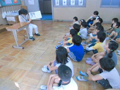 1年生の子どもたちは,毎月の「読み聞かせ」を,とても楽しみにしています。今日は,「あしニョキニョキ」と「しゅくだい」という2つのお話を,読み聞かせボランティアの方々が紹介して下さいました。子どもたちは生き生きとした表情で,挿絵をじっと見つめながら,一生懸命にお話を聞いていました。本の世界を,みんなで楽しむことができました。
