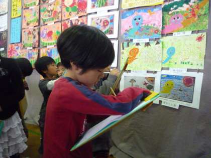 2時間目に,「お話を聞いて絵にしよう」で描いた作品の鑑賞をしました。自分たちのクラスの作品だけでなく,ひまわり教室から6年生まで,いろいろな作品を見ることができました。