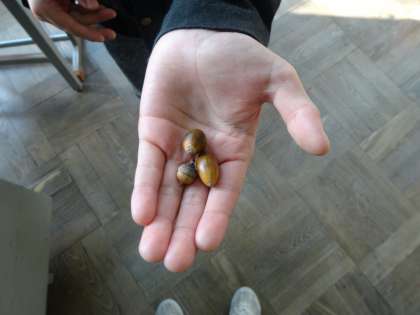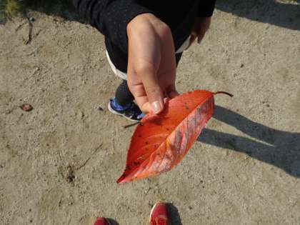 生活科では,きせつとあそぼうという学習をしています。国語の学習でも「秋」について考えました。すると…「今日,ドングリを見つけました。」「とてもきれいな落ち葉があったよ。」と見つけた秋を紹介してくれました。紫明富士の近くをみんなで歩いていると,落ち葉でもたくさんの種類の落ち葉を見つけることができて大喜びでした。この落ち葉を使って何が出来るでしょうか。これからの学習が楽しみですね。