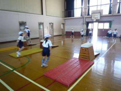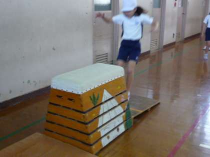 とび箱あそびでは,跳び上がったり跳び下りたり,またいだりしてとび箱に親しむ活動をしていましたが,子どもたちの意欲は素晴らしいものです。