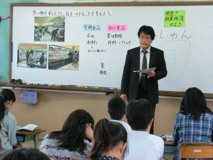 また,ゲストティーチャーとして,市役所の東部農業振興センターから高橋さんに来ていただき,野菜の旬や地産地消についてのお話をしていただきました。