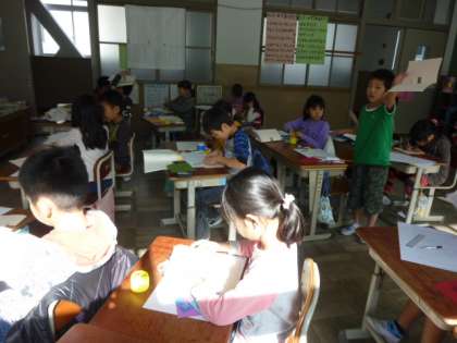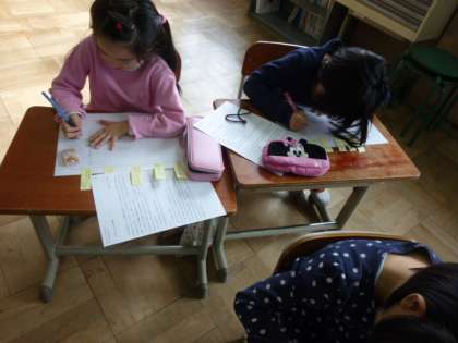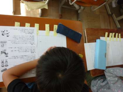 2年生は、国語「読んで、せつめいのしかたを考えよう」の学習をしていました。実際にしかけカードを作ることを通して説明文を読み取っていったり、どんなところが分かりやすく説明されているのかを考えたりしています。実際に文章を書くところでは、付箋を使って文章の構成を分かりやすくして丁寧に書いていました。ノートの文字がとても丁寧になってきています。がんばっています。