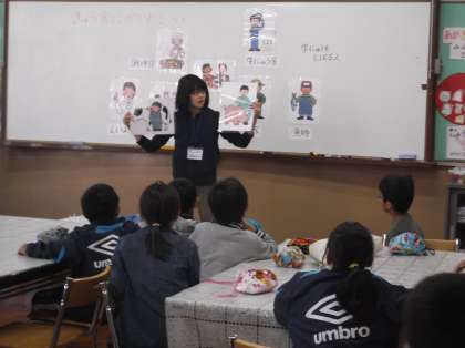 今日は,ランチルームで久保田先生による食育「給食にかかわる人々」を学習しました。