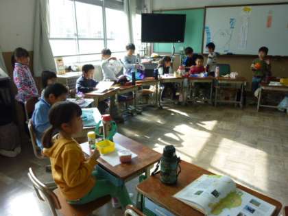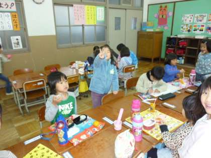 11月15日は、秋の遠足の予定でした。残念ながら雨!「でも、お弁当持ってきているし。」とにこにこ登校してきました。1年と2年は、教室で食べていました。22日には絶対行けますように。梅小路公園に行く予定です。かわいいおにぎりの説明を沢山の子どもたちがしてくれました。おいしそう!