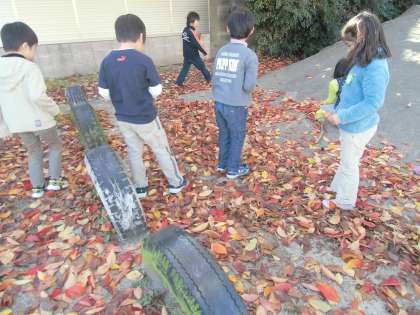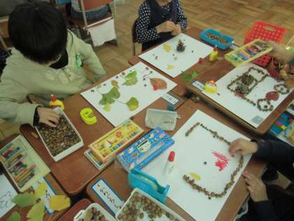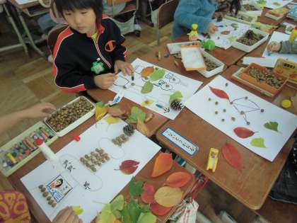 1年生の子どもたちが,生活科の学習で,秋の素材を使って作品を作りました。船岡山公園で集めたどんぐりや松ぼっくり,学校の校庭で見つけた綺麗な色の葉っぱなどを使い,いろいろな形を表現しました。出来上がった作品を見せ合って,良いところや,工夫しているところに気付くことができました。