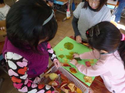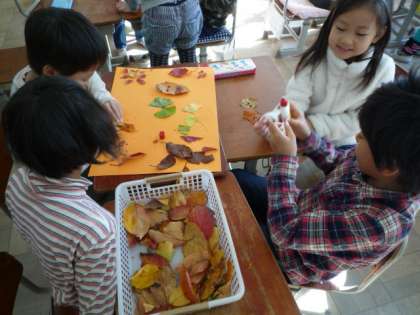 「秋見つけ」で見つけた落ち葉などを使って,グループで作品を作りました。