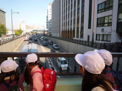 歩いている途中,高架上ではたくさんの車を見て喜んでいました。