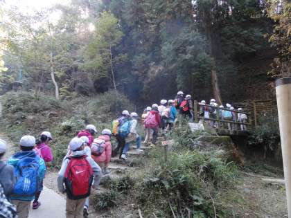 さあ,いよいよ登山口です。「ファイト!」の声とともに,登り始めました。道の木々や水,石などを見て,「きれいな葉っぱ。グラデーションになってる。」,「あっ!わき水や!こないだ道徳のお話であった!」,「水が透き通ってる。」,「木の間からもれてくる光で,葉が光ってる。」など,話しながら登っていました。