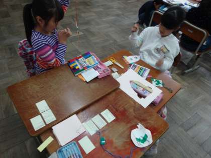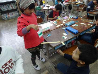 ストローや厚紙を使って,ひっぱると上に上るおもちゃを作りました。子どもたちは,何に気を付けると上手に作ることが出来るのかということを考えながら作りました。今日作ったおもちゃを使っておもちゃの説明書を作ります。作るときに,気付いたことや,分かったことを書いて,説明書を完成させるぞ!