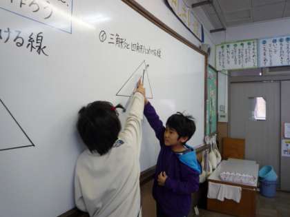 今日は三角形や四角形を切って,三角形を2つ作ったり,三角形と四角形を作ったりする学習をしました。