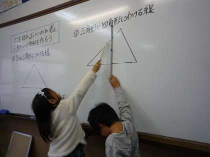 自分で考えて活動し,そしてそれをとなりの友だちと伝え合い,前でどこを切るのか,そうして何ができるのかを説明しました。