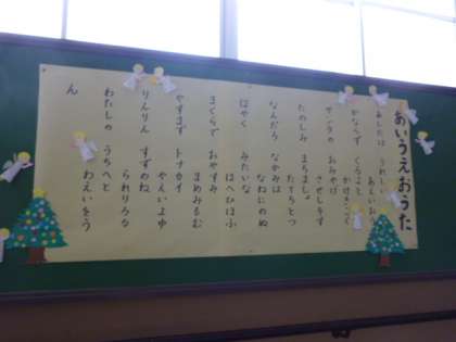 「あしたは うれしい あえいおう」・「かならず くるよと かけきこく」・「さんたの おみやげ させしそす」 なかなかの口の運動です。今月の詩「あいうえおうた」です。朝の会で毎日声を出して練習しているクラスがあります。校長室まで聞こえてきます。嬉しいことです。お家でも練習していることでしょう。16日(月)の紫明タイムでみんなで声を合わせます。