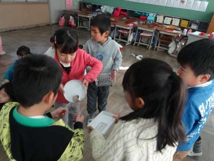 生活の学習で,空き箱などをつかって遊べる遊びを考えてきました。今までは,グループで作っていましたが,今回は,クラスみんなで遊びを考えました。
