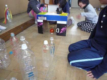 写真左右 ゴムの力を利用してとばし,ペットボトルを倒す ボーリング。
