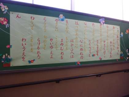 季節の「あいうえお」シリーズが続いています。大きくはっきりと口をあけること、声を合わせることなどいろいろ考えながら練習しています。1月の紫明タイムは、1月30日で1年生です。その時に全校で声を合わせます。「やさしい こころで やいゆえよ・・・わらって ことしも わいうえお・・・」教室で、ただいま練習中です。