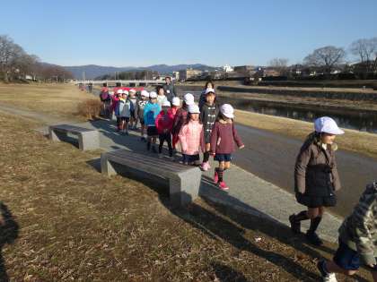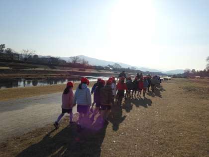 今日は,1年生と2年生とひまわり学級の子どもたちで,適応マラソンの下見に行きました。子どもたちは,「あっちの橋からこっちの橋まで。長いけど走り切れるかな。」と不安の声や,「本番までに業間マラソン頑張ってはやく走れるようになろう。」と気合いが入った子どももいました。