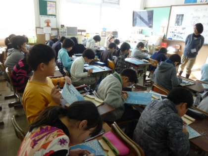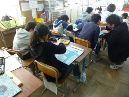 4年生の教室でも版画をしていました。「これ、お母さんが子どもの時に使ったはった彫刻刀です。」と話してくれました。手入れをして大切に使えば、親子で使えるんですね。あったかいものを感じました。嬉しいです。
