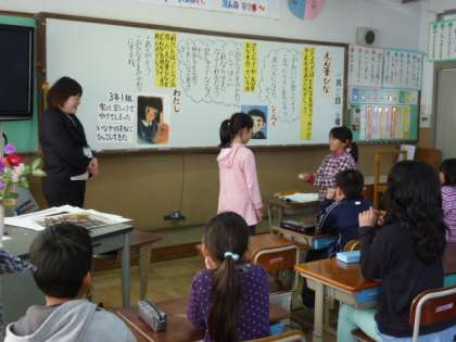 3年生も研究発表会で授業を見ていただきました。「鉛筆びな」という資料を使って相手の気持ちを考えながら、仲良くしていくことについて考えました。登場してくる「シンペイくん」「わたし」になりきって、考えました。教室いっぱいの参観の先生でした。