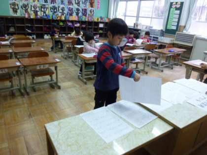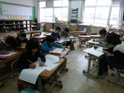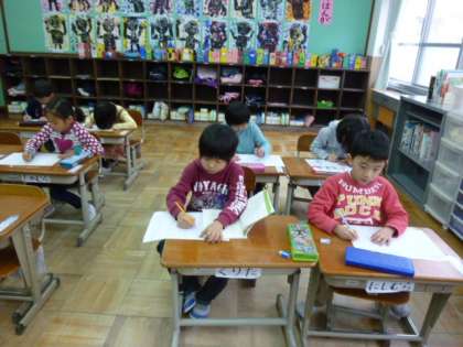 低学年も、静かな中で黙々と学習に取り組んでいました。「校長先生、今日は中間休みはないのですか?」と、1年生が質問してきました。「今日は土曜学習だよ。」とこたえました。すると周りの子どもたちが、「だって、朝の走ろう会なかったやん!」「朝の会もないし。」という楽しい会話がありました。沢山のプリントでおさらいをしていました。