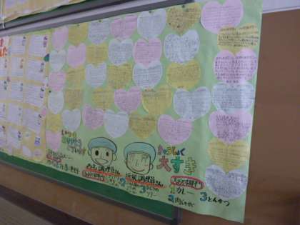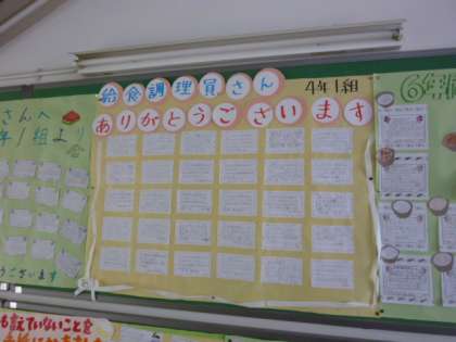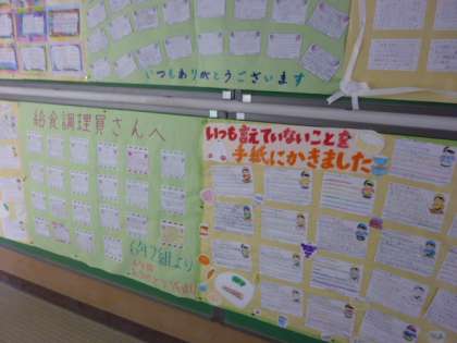 いつもおいしい給食を作ってくださっている給食調理員さへお手紙を書きました。本校には、2人の給食調理んさんがいてくれます。ありがとうございます。「ぼくは、・・・が好きです。」「普段言えないことを書きます・・・?」みんなが心をこめて書きました。いつもいいにおいがしてくるとおなかが、グーとなってしまいます。??