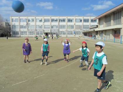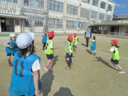 1年生は,体育の学習で,「ボールけりゲーム」に挑戦しています。4人でチームを作り,足でボールをけってパスをつなぎ,シュートをします。ゲーム中は,チームのメンバーと声を掛け合って,一生懸命にボールを追いかけています。作戦タイムでは,どこに動けばパスを受けやすいのか,誰が誰をガードするのかなどを,仲間と相談していました。子どもたちは広い運動場をいっぱい使って,のびのびと「ボールけりゲーム」を楽しんでいます!
