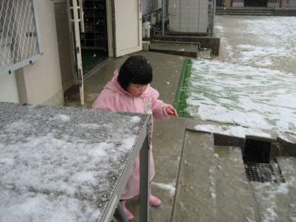 先週、たくさん雪が降りました。雪遊びをしようと外に出たのですが、雪の水分が多くあまりできませんでした。最近では雪が積もることがなかったので、とても良い経験ができました。雪で真っ白な景色を見て、みんなで『雪やコンコン』を歌いました。