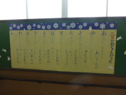 今月の詩「2月のあいうえお」「あかおに あおおに あいうえお」「かけてく にげてく かきくけこ」・・・「わたしも なかまに わいうえを ん」家でも練習しているでしょうか?24日(月)今年度最後の紫明タイムで声を合わせます。そして、心も合わせます。がんばりましょう。発表は、6年生です。