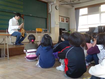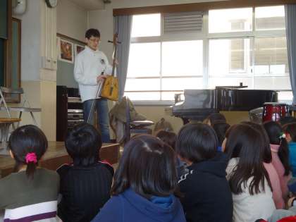 今日は,ボヤンさんという先生をお迎えして,馬頭琴についてお話していただいたり,演奏していただいたりしました。子どもたちは,初めて聞く音色に聞き入っていました。スーホの白い馬を演奏していただいた時には,お話を想像しながら聞くことが出来ました。また,日本の曲も弾いて下さいました。子どもたち,たくさんの発見をしていたようでした。教科書の中だけでなく,実際に触れることができてとてもよかったです。