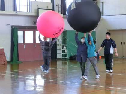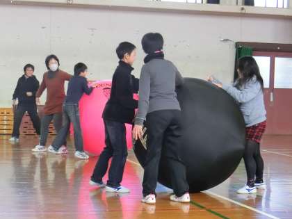 楽しみにしていた「お別れ会」。体育館でキンボールをしました。直径120センチととても大きなボールですが,重量は1キログラムと軽く,とても弾むので扱いが大変!それを利用して友達や保護者の人と協力してするゲームに興じました。