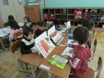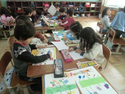 1年生(新2年生)の子どもたちは,4月に入学してくる新1年生の教室の準備を進めています。みんなで話し合った結果,1年間の学校生活がよく分かるように,行事や活動を紹介する絵と説明文を教室に飾ることになりました。春・夏・秋・冬の4つの季節のグループに分かれて,その季節に実施した行事や活動を思い出しました。そして,どんなことをしたのか,どこで誰とやったのか,どんな気持ちになったのかなどを,ていねいに絵と文で表現しました。子どもたちは,「新1年生に早く見てほしいな!」と,わくわくしているようでした。