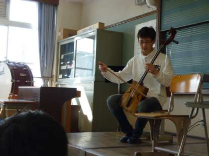 ちょっと前のことになりますが、3月4日に2年生が「馬頭琴」と出合いました。国語でちょうど「スーホの白い馬」を学習した後でした。留学生の方に来ていただきすてきな音色を聞かせていただきました。モンゴルでは、「馬の楽器」呼ばれているそうです。先端の部分が、馬の形をしています。素晴らしかったです。