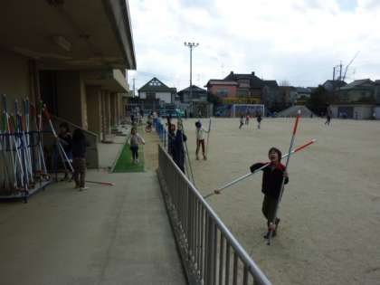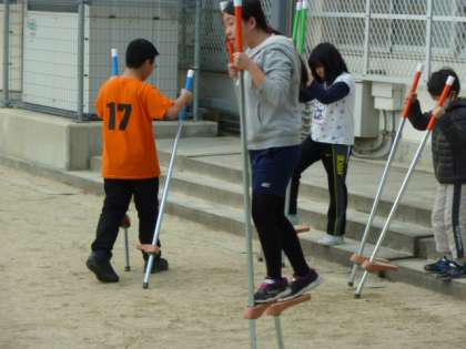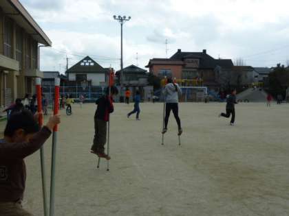 育友会の方々から頂いた竹馬が大人気です。もうすぐ卒業の6年生が乗っているのを発見しました。保育園の時に乗っていたんだそうです。なつかしい!小さいときに乗っていると大きくなってもちゃんと乗れるんですね。あまりに上手なので拍手をしました。学年を超えて、コツを教えあいながら、竹馬を楽しんでいます。紫明小学校では、「ひそかなブーム?」です。