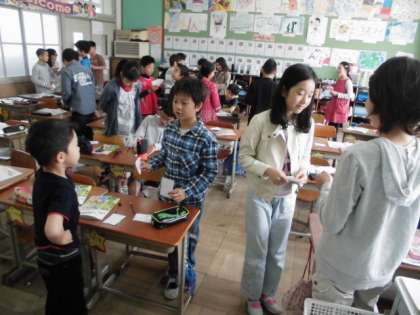 外国語の授業で,名刺交換をしました。名刺交換の際には「My name is 〜 」や「Nice to meet you.」などのフレーズを使いました。友達の名刺をもらうと,とてもうれしそうな表情をしていました。