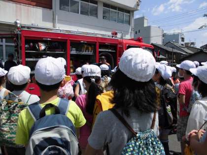 お話を聞いた後は,外に出て消防車や消防車の中に入っている道具についてみたり触ったりしました。「重いなあ!」「大きいなあ」と嬉しそうに活動しました。