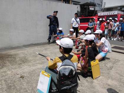 「火事だあ!」と大きな声を出しながら子どもたちは一所懸命に水を出していました。色々な経験をして話も聞くことができてとても充実した社会見学だったようです。